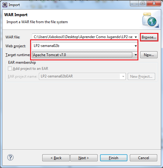 1. Importar el archivo war, clic en File>Web>War File, cambiamos el nombre del proyecto y seleccionamos el servidor de aplicaciones.